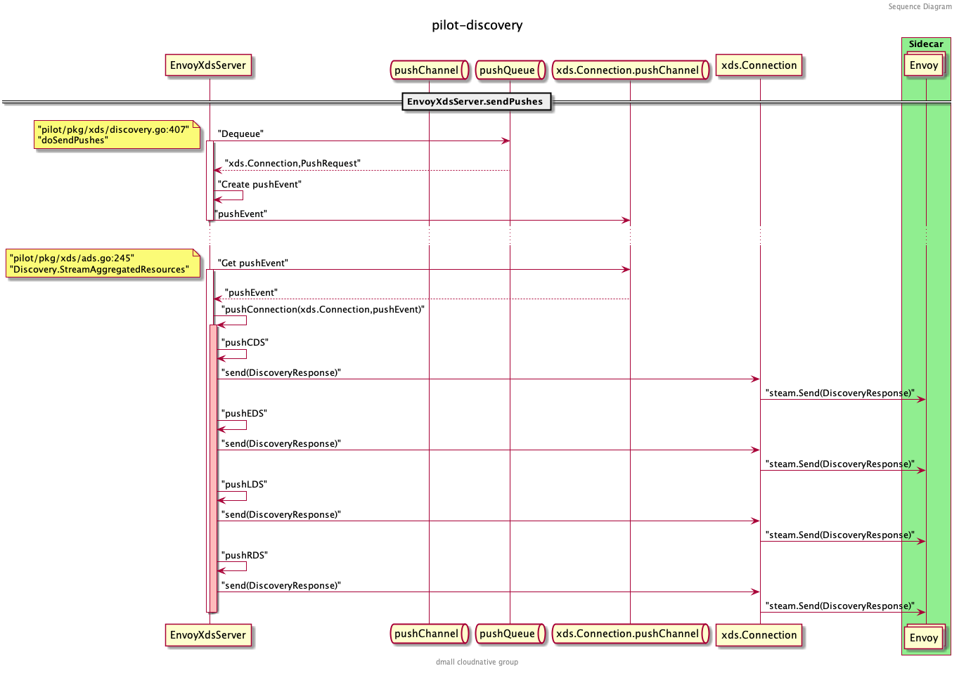 在 Push() 方法更新了 PushContext 之后便调用 AdsPushAll() 和 startPush(req) 将 PushRequest 重新入队到了 DiscoveryServer.pushQueue :